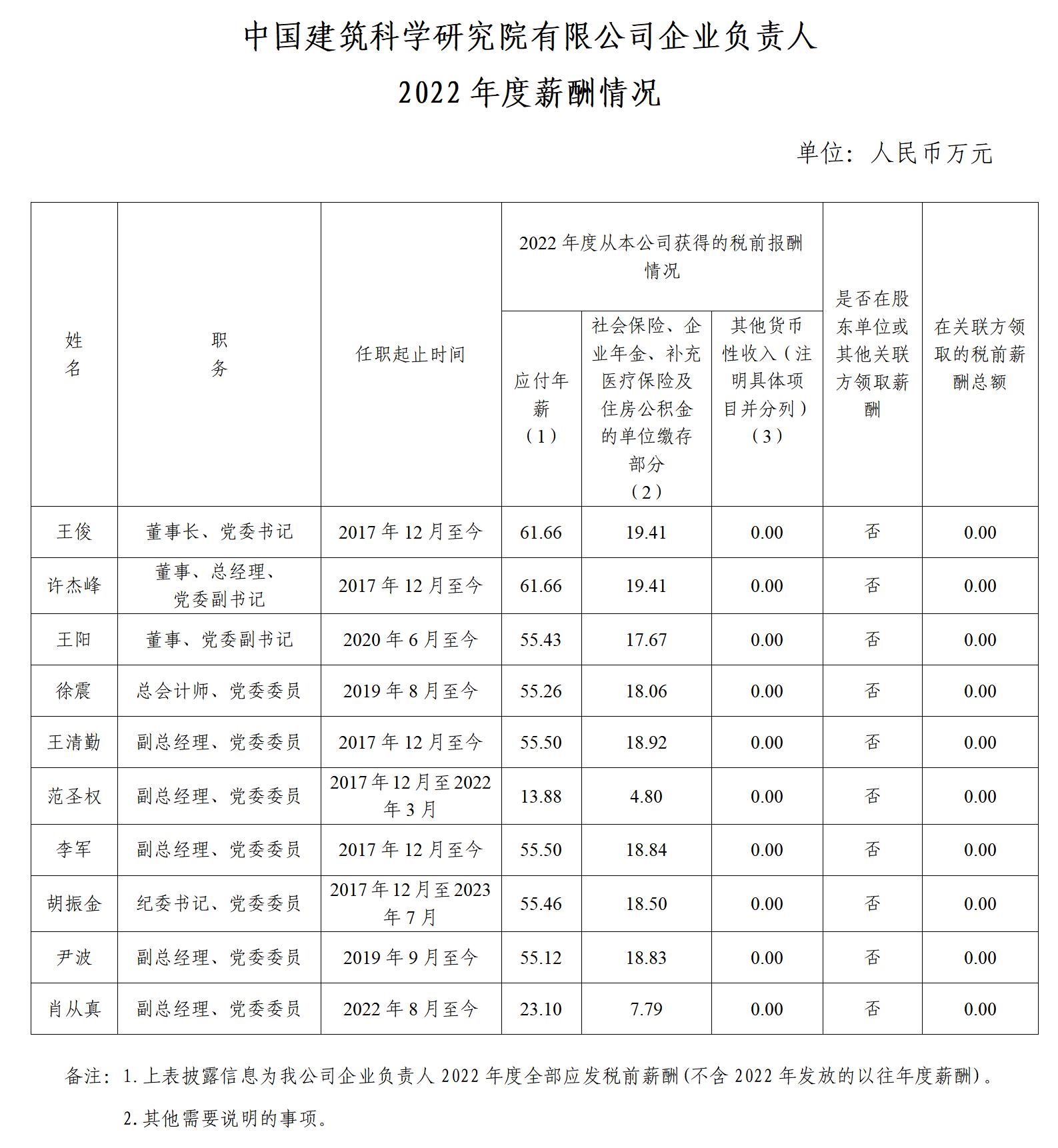【企業(yè)負(fù)責(zé)人薪酬】中國建筑科學(xué)研究院有限公司企業(yè)負(fù)責(zé)人2022年度薪酬情況